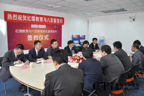 簽約當(dāng)日,八百客與紅纓教育在北京中關(guān)村軟件園舉辦隆重的“信息化管理啟動會”。紅纓總經(jīng)理王紅兵、八百客CEO李智等參加此次項目的啟動會。