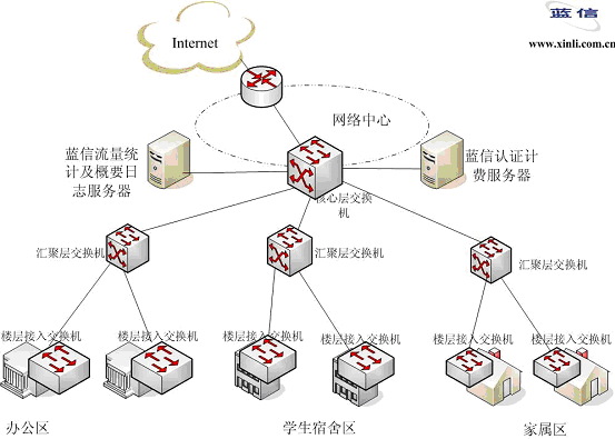 在網(wǎng)絡(luò)中心機(jī)房部署“藍(lán)信認(rèn)證計(jì)費(fèi)系統(tǒng)”,藍(lán)信認(rèn)證計(jì)費(fèi)系統(tǒng)除支持標(biāo)準(zhǔn)的RADIUS協(xié)議外,還支持領(lǐng)先的802.1x協(xié)議,通過與各接入層交換機(jī)的配合,實(shí)現(xiàn)了認(rèn)證管理功能。通過綁定帳號、IP、MAC地址等15元素,真正保證只有合法用戶才能通過認(rèn)證;對用戶進(jìn)行分級權(quán)限管理,可按信用度等級對用戶進(jìn)行劃分,方便了用戶的管理。此外,在網(wǎng)絡(luò)出口處部署藍(lán)信流量統(tǒng)計(jì)工具,通過與藍(lán)信認(rèn)證計(jì)費(fèi)系統(tǒng)的配合,實(shí)現(xiàn)對用戶按流量來計(jì)費(fèi),可以把用戶訪問流量按校內(nèi)校外、國內(nèi)國際來區(qū)別對待,并設(shè)置不同的費(fèi)率。同時(shí),還部署了藍(lán)信概要日志系統(tǒng),有效記錄了用戶的上網(wǎng)信息,并提供人性化的web客戶端,方便管理者進(jìn)行事后查詢,有效的控制了網(wǎng)絡(luò)的安全性。