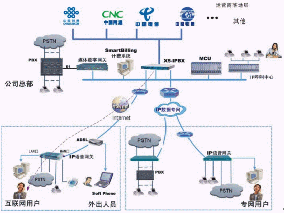 - 中心的X5-IPBX系統(tǒng)可以服務于互聯(lián)網(wǎng)用戶和企業(yè)內部數(shù)據(jù)專網(wǎng)用戶,實現(xiàn)雙網(wǎng)匯接,使得不同網(wǎng)絡中的用戶可以實現(xiàn)IP電話通信。
