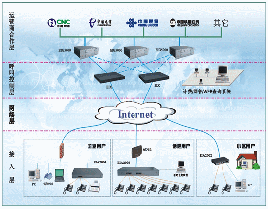 - 在運營商合作層,EIG5000系列是集軟交換為一體的數(shù)字中繼網(wǎng)關,與傳統(tǒng)運營方案比減少了設備投入,更加保證可靠方便的應用,EIG5000系列可以配合網(wǎng)管系統(tǒng)、計費系統(tǒng)、WEB管理系統(tǒng)組成整個完整的局端運營系統(tǒng),而增加EIX7100設備可以更好的冗余備份,使整個運營平臺更加穩(wěn)定。EIA設備根據(jù)客戶類型和需求配置相應的設備;