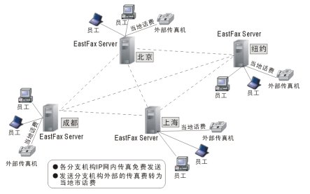 如果集團各分支機構(gòu)都各使用一套EastFax,通過因特網(wǎng)的連接,可將企業(yè)分布在全球或全國的傳真并入集團傳真服務(wù)器系統(tǒng),實現(xiàn)傳真線路自動路由,這樣企業(yè)總部和各分支機構(gòu)之間的傳真通訊費為零,如同內(nèi)部發(fā)送。如發(fā)送系統(tǒng)以外的長途傳真,本地服務(wù)端智能識別,將傳真任務(wù)提交到與長途傳真區(qū)號相匹配的傳真服務(wù)器上發(fā)送出去,從而將長途傳真費用減少為本地傳真通訊費用。此功能節(jié)省了集團系統(tǒng)內(nèi)部發(fā)送傳真的費用,節(jié)省高額的長途電話費用。適用于多分支機構(gòu)的集團公司。