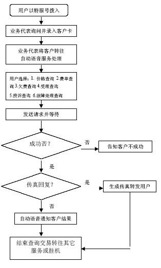 系統(tǒng)自動報受理人員工號,人工交互式受理方式。受理人員根據(jù)用戶要求從服務(wù)質(zhì)量標(biāo)準(zhǔn)數(shù)據(jù)庫、電費數(shù)據(jù)庫和其他相連的數(shù)據(jù)庫查詢資料,然后通過語音方式播報資料或送到用戶指定的傳真機或其他終端設(shè)備上。主要內(nèi)容如下: