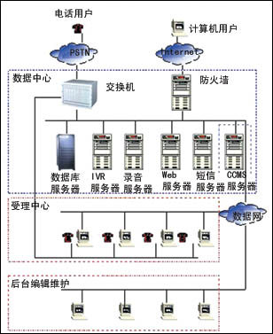 系統(tǒng)的體系結(jié)構(gòu),主要包括三個(gè)部分:數(shù)據(jù)中心、受理中心和維護(hù)中心。受理中心與數(shù)據(jù)中心之間采用E1連接,具有2M的數(shù)據(jù)通信能力;維護(hù)中心與數(shù)據(jù)中心之間采用64K DDN線路連接,三個(gè)中心分布在三個(gè)不同的地方。目前受理中心負(fù)責(zé)全省的所有業(yè)務(wù),客戶通過本地市話經(jīng)由移動電信網(wǎng)絡(luò)將話路指向受理中心,通過數(shù)據(jù)中心的具有排隊(duì)功能的交換機(jī),根據(jù)被叫號碼和客戶服務(wù)要求,將講話路轉(zhuǎn)接到自動臺或人工臺席,為客戶提供服務(wù)。當(dāng)用戶呼叫信息臺電話后,進(jìn)入到交換機(jī),交換機(jī)將來話消息通知驅(qū)動池,驅(qū)動池將相關(guān)消息轉(zhuǎn)換為標(biāo)準(zhǔn)格式,通知CCMS,CCMS根據(jù)來話被叫號,根據(jù)管理系統(tǒng)的定義,啟動相應(yīng)的IVR腳本,交給IVR解釋器解釋并由IVR服務(wù)器執(zhí)行,當(dāng)服務(wù)為自動臺完成時(shí),由IVR服務(wù)器實(shí)現(xiàn)(如:語音引導(dǎo)、適合自動服務(wù)的內(nèi)容等);當(dāng)用戶需要人工服務(wù)時(shí),CCMS管理系統(tǒng),根據(jù)用戶的服務(wù)要求,按照話路分配原則(通過管理系統(tǒng)定義),選擇最合適的話務(wù)員為其服務(wù),同時(shí)CCMS管理系統(tǒng)會將相關(guān)的頁面在話務(wù)員的臺席上顯示出來,同時(shí)顯示主叫號碼以及來話標(biāo)示,當(dāng)話務(wù)員應(yīng)答后,即可開始受理,受理的內(nèi)容通過Web服務(wù)器完成,同時(shí)對于需要查詢數(shù)據(jù)庫的訪問,通過應(yīng)用服務(wù)器,進(jìn)行數(shù)據(jù)訪問,并返回結(jié)果。當(dāng)服務(wù)完畢,本次呼叫即結(jié)束。
