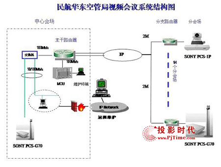 為了建成“具有華東特色,符合總局要求”的視頻會議系統(tǒng),空管局領導經過嚴格的考察和甄選后,最后采用了Sony的視頻會議系統(tǒng)解決方案,包括5臺PCS-G70和10臺PCS-1P。整個項目運行在民航數(shù)據(jù)網(wǎng)(ATM網(wǎng))的環(huán)境下,共有24個節(jié)點,設備分布呈星型結構。