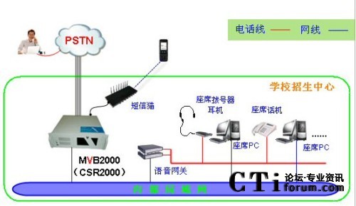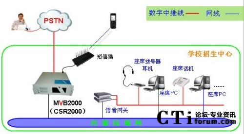 暢信達電話招生呼叫中心是采用數字中繼線(或者模擬電話線)接入,人工座席受理,采用MVB2000作為呼叫中心交換系統(tǒng),CSR2000作為呼叫中心業(yè)務系統(tǒng)的系統(tǒng)架構形式,系統(tǒng)架構圖如下: