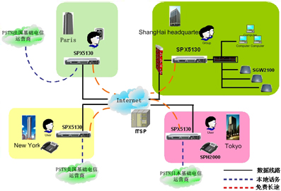 隨著公司在全世界開設(shè)眾多的部門,IP電話技術(shù)將會(huì)是不同分公司之間實(shí)現(xiàn)低費(fèi)用高品質(zhì)語(yǔ)音通訊的方式。SINOCO公司的IP-PBX 系統(tǒng)解決方案,利用 SPX-5130設(shè)備通過互連網(wǎng)連接到公司的各個(gè)分支機(jī)構(gòu),提供分級(jí)體系結(jié)構(gòu),更進(jìn)一步提供了可靠的,靈活的語(yǔ)音通訊解決方案,從而滿足公司快速回應(yīng)客戶的需求。同時(shí),它也降低了總部和分部之間的電話費(fèi)用?偛亢头植块g昂貴的國(guó)際電話費(fèi)用將不再存在, 而且享受高品質(zhì)的語(yǔ)音通訊質(zhì)量。