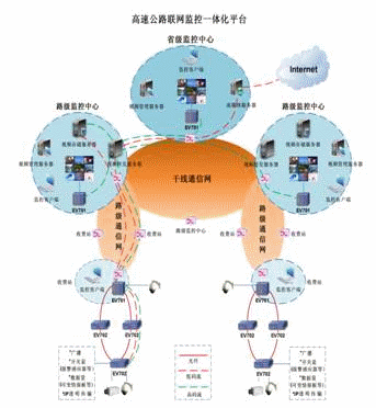 該系統(tǒng)集數(shù)字視頻傳輸、視頻管理、視頻存儲(chǔ)以及外網(wǎng)發(fā)布等功能為一體。 EV701中心設(shè)備有4個(gè)業(yè)務(wù)槽,可任意插拔編解碼卡,最多支持8路視音頻數(shù)據(jù)。采用H.264編碼標(biāo)準(zhǔn)的EV702外場綜合接入設(shè)備,將原來外場分散的攝像頭、快球、云臺(tái)、可變情報(bào)板、報(bào)警感應(yīng)器等設(shè)備融為一體,同時(shí)也支持MPEG編碼標(biāo)準(zhǔn)的視音頻接入?梢酝瑫r(shí)編碼2路以上的視音頻信號(hào),支持雙流傳輸,D1數(shù)據(jù)用于實(shí)時(shí)觀看,CIF數(shù)據(jù)用于存儲(chǔ)和Web網(wǎng)業(yè)務(wù)(包括對外發(fā)布實(shí)時(shí)圖像和管理人員異地監(jiān)控)。具備IP開關(guān)斷功能,減輕了通信網(wǎng)絡(luò)的壓力。 路級中心、區(qū)域中心、省級中心分布式多級監(jiān)控,由省中心統(tǒng)一設(shè)定權(quán)限,進(jìn)行集中管理。