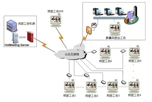 新疆建設(shè)兵團(tuán)工會下設(shè)有14個師工會,111個團(tuán)場工會.共有200個用戶同時參加視頻會議。中心服務(wù)器帶寬為100M光纖,各地終端通過網(wǎng)通2M寬帶接入,每個師、團(tuán)級會場都有自己獨立的機(jī)房和會議室,適合進(jìn)行基于IP網(wǎng)絡(luò)視訊會議的應(yīng)用,在這個網(wǎng)絡(luò)平臺上,優(yōu)視(URSACOM)HotMeeting富媒體視頻會議系統(tǒng)所提供的高質(zhì)量的視頻圖像和方便易用的文檔、文件共享功能,使得兵團(tuán)工會領(lǐng)導(dǎo)能夠在這個平臺上進(jìn)行從桌面討論到會議室正式會議等各種規(guī)模應(yīng)用。通過HotMeeting富媒體視頻會議系統(tǒng),除了進(jìn)行全團(tuán)工會系統(tǒng)例會,工作交流等常見的應(yīng)用之外,遠(yuǎn)程培訓(xùn)等也是經(jīng)常進(jìn)行的內(nèi)容。各個師、團(tuán)工會系統(tǒng)能利用數(shù)據(jù)功能和兵團(tuán)總工會協(xié)調(diào)業(yè)務(wù),也能把平常培訓(xùn)的會議材料進(jìn)行詳細(xì)介紹,節(jié)約了以前培訓(xùn)所花費的大量精力和時間。具體網(wǎng)絡(luò)拓?fù)湟娤聢D: