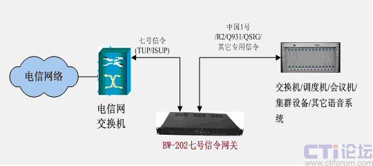 BW-202七號(hào)信令網(wǎng)關(guān)可實(shí)現(xiàn)多種信令方式與七號(hào)信令之間的互通。在當(dāng)前的電信網(wǎng)絡(luò)中,七號(hào)信令(SS7)系統(tǒng)已經(jīng)廣泛應(yīng)用,但很多傳統(tǒng)設(shè)備都還不具有七號(hào)信令接口,有些設(shè)備即使具有但也不標(biāo)準(zhǔn),BW-202七號(hào)信令網(wǎng)關(guān)能以最經(jīng)濟(jì)的方式幫助這些設(shè)備以標(biāo)準(zhǔn)的信令方式與七號(hào)信令設(shè)備連接, 其典型用法如圖所示: