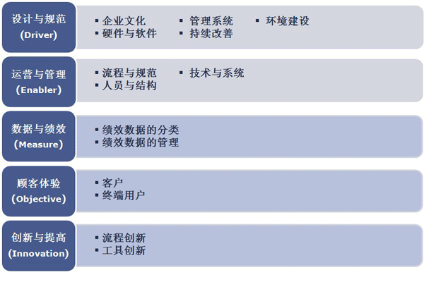 呼叫中心能力成熟度認(rèn)證涉及設(shè)計(jì)與規(guī)范、運(yùn)營(yíng)與管理、數(shù)據(jù)與績(jī)效、顧客體驗(yàn)、創(chuàng)新與提高5大類(lèi),14項(xiàng)評(píng)審指標(biāo)以及若干個(gè)值得關(guān)注的管理項(xiàng)目。是一套完整的“客戶(hù)為中心”的績(jī)效管理工具。