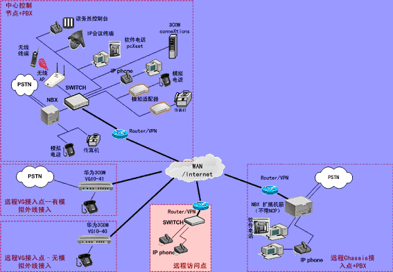 ③.遠(yuǎn)程接入的辦公室不再需要專用的 PBX, 只需要將3Com NBX電話終端接入到WAN網(wǎng)中,就能地實現(xiàn)在WAN或Internet上與3Com NBX 網(wǎng)絡(luò)電話系統(tǒng)的互連。