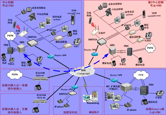 ②.統(tǒng)一的分支機(jī)構(gòu)電話平臺,可以支持任何數(shù)據(jù)骨干網(wǎng)(WAN)技術(shù),包括DDN、幀中繼、VPN、xDSL等。3COM NBX 系統(tǒng)也可以在無線局域網(wǎng)上運行。