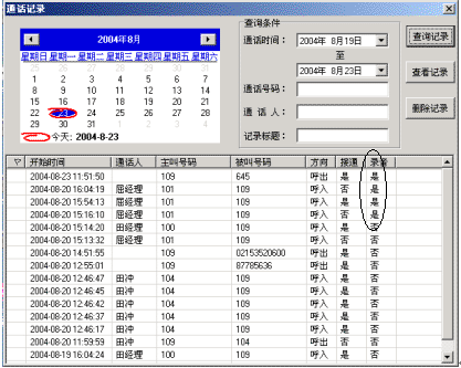 當(dāng)您在接打電話時,可以利用 NBX-TCA對當(dāng)前的通話進(jìn)行錄音,以方便您對重要信息的記錄和查找。您可以在通話記錄中對已錄音的記錄進(jìn)行查找,如下圖所示。打開通話記錄,選擇按錄音查找方式查看已有的錄音即可。