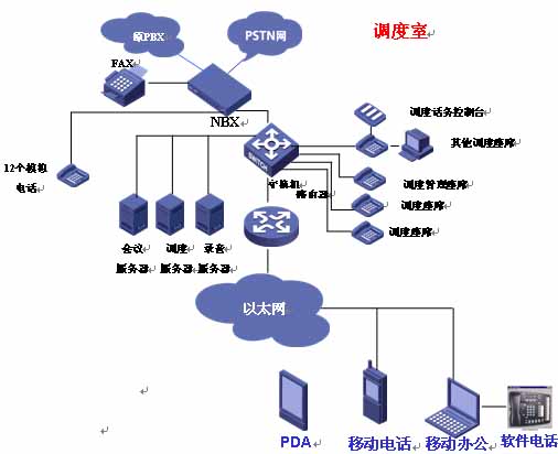 北京市交通應(yīng)急指揮中心,此次項(xiàng)目采用了1500個(gè)設(shè)備容量的華為3Com V3000 NBX系統(tǒng)一臺(tái)為核心語音調(diào)度交換機(jī),連接PSTN網(wǎng)。使用3101標(biāo)準(zhǔn)版IP智能話機(jī)、3102商務(wù)版IP智能話機(jī)和3105話務(wù)臺(tái)總數(shù)量達(dá)到了34部。在已有的網(wǎng)絡(luò)結(jié)構(gòu)中實(shí)施語音系統(tǒng),減少對網(wǎng)絡(luò)基礎(chǔ)設(shè)施的投資,節(jié)省話路設(shè)備成本、電話系統(tǒng)安裝、維護(hù)和使用管理,還可提供更多的通信業(yè)務(wù)和更強(qiáng)的智能語音功能。結(jié)構(gòu)圖如下: