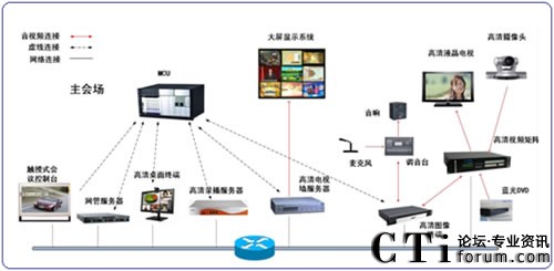 其中迪威高清視頻會議系統(tǒng)主要由:一臺高清MCU、10個高清硬件終端、18個高清桌面終端、一臺高清錄播服務器以及一個網(wǎng)管系統(tǒng)組成。如圖所示: