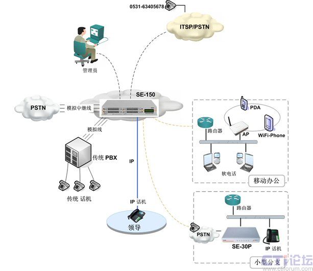 在企業(yè)總部可以部署一臺(tái)IP-PBX(如SE150)作為核心設(shè)備,通過(guò)模擬中繼接口連接PSTN電話網(wǎng),通過(guò)模擬分機(jī)接口連接企業(yè)原有的PBX交換機(jī),再通過(guò)IP話機(jī)或網(wǎng)關(guān)來(lái)擴(kuò)展新增用戶(hù)。IP-PBX下的分機(jī)用戶(hù)可以通過(guò)模擬中繼連接外線電話,也可以通過(guò)IP中繼連接到ITSP的NGN平臺(tái)實(shí)現(xiàn)外線呼叫,系統(tǒng)通過(guò)路由設(shè)定來(lái)自動(dòng)判斷分機(jī)的對(duì)外呼叫應(yīng)該由哪條中繼處理,實(shí)現(xiàn)最優(yōu)路由和話費(fèi)的最大節(jié)省。