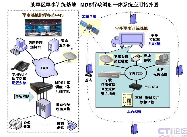 為了加強現(xiàn)代化軍隊的建設(shè),某軍區(qū)在其軍分區(qū)的指揮訓練基地,使用先進的技術(shù),搭建了一套由幾十輛軍事指揮車組成的作戰(zhàn)指揮訓練系統(tǒng),其中的語音通信指揮系統(tǒng)部分,采用了美國Zed-3公司最先進的基于IP技術(shù)的MDS80行政調(diào)度一體化通信系統(tǒng),解決了訓練基地的指揮中心大樓的原有通信系統(tǒng),與室外的訓練基地各輛指揮車之間,通過基地無線網(wǎng)絡(luò)及衛(wèi)星備份鏈路提供的IP通道,實現(xiàn)語音的指揮調(diào)度通信,達到訓練基地要求的最佳的語音指揮調(diào)度通信效果。