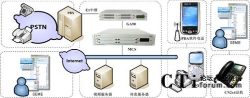 4)該系統(tǒng)支持多類終端,辦公人員不僅可以通過登陸SEME辦公軟件在線辦公,還可以配備臺式CN2x4VOIP電話、在PC上安裝SP3軟件電話及使用帶有WIFI功能的手機進(jìn)行VOIP免費通話。