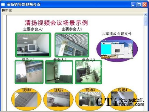 簡單的操作以后,一個生動的會議場面就出現在眼前。效果如圖一所示。軟件屏幕墻的使用讓每個參會人又重新找回了聚在了一個會議室里進行會議的感覺。 具體的操作請參見用戶手冊會議屏幕墻的使用。