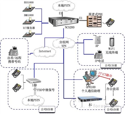 整個系統(tǒng)內(nèi)部通過主流標(biāo)準(zhǔn)協(xié)議聯(lián)結(jié),支持與運(yùn)營商IMS網(wǎng)絡(luò)的無縫對接。新增分支機(jī)構(gòu)只需增加NC5200系列IP-PBX或者IAD即可融入公司整個通信系統(tǒng)。