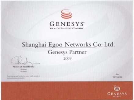 上海易谷與Genesys公司雙方在2009年達成大中華區(qū)長期合作伙伴關系,開展廣泛、深入的合作。上海易谷將憑借其深厚的技術背景、優(yōu)質的服務能力,積極推動世界第一的CTI及SIP新一代呼叫中心基礎平臺。為配合產(chǎn)品多樣化、專業(yè)服務的發(fā)展戰(zhàn)略,與