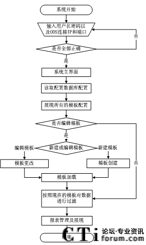 根據(jù)流程圖,使用者在進(jìn)入系統(tǒng)時(shí)需要輸入用戶名和密碼以及要連接的ODS數(shù)據(jù)源的IP和端口。如果信息正確,則進(jìn)入到報(bào)表系統(tǒng)主界面。然后報(bào)表設(shè)計(jì)工具會(huì)從配置數(shù)據(jù)庫中讀取報(bào)表模板配置,再將現(xiàn)在統(tǒng)計(jì)數(shù)據(jù)的報(bào)表模板信息展現(xiàn)出來。