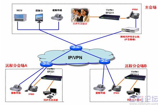 當(dāng)視頻會議召開時(shí),主會場的翻譯既通過同聲傳譯系統(tǒng)把翻譯好的內(nèi)容傳輸?shù)奖镜氐呐c會者,也通過IP音頻會議系統(tǒng)把翻譯好的內(nèi)容傳輸?shù)竭h(yuǎn)端的會場,遠(yuǎn)端會場把音頻系統(tǒng)傳輸過來的聲音經(jīng)過EF2211聲音處理系統(tǒng)處理后傳輸?shù)酵晜髯g系統(tǒng),同聲傳譯系統(tǒng)把聲音經(jīng)無線耳機(jī)傳送給需要的與會者。這樣遠(yuǎn)端會場的與會者既可以聽到主會場的原聲,也可以聽到翻譯好的內(nèi)容。相反,當(dāng)分會場發(fā)言時(shí)分會場也可以把本會場的原聲和翻譯好的內(nèi)容傳輸?shù)街鲿䦂。這樣就可以實(shí)現(xiàn)遠(yuǎn)程同聲傳譯。能同時(shí)滿足與會的所有人員的翻譯需求,既做到翻譯內(nèi)容的統(tǒng)一,又節(jié)省了翻譯人員的人力成本。
