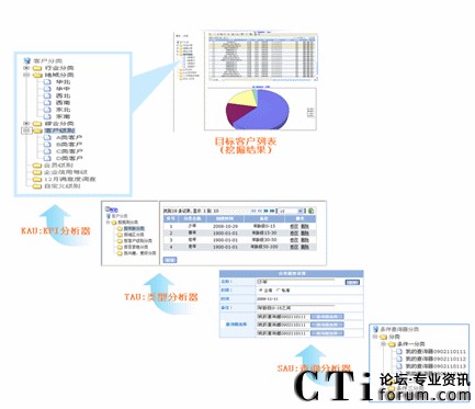 客戶(hù)關(guān)系管理,以KPI分析器(KAU)、查詢(xún)分析器(SAU)、類(lèi)型分析器(TAU)為核心,實(shí)現(xiàn)客戶(hù)信息管理、查詢(xún)、分類(lèi)、挖掘的目標(biāo)需求: