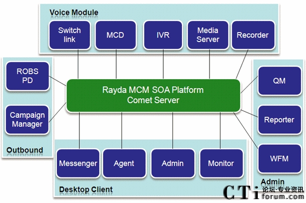 Rayda MCM多渠道呼叫管理平臺,是呼叫中心基礎(chǔ)呼叫業(yè)務(wù)的信息化支撐平臺系統(tǒng)。Rayda MCM以先進(jìn)的呼叫信息交互為核心,涵蓋呼叫中心系統(tǒng)所必須的ACD、IVR、PD、錄音、質(zhì)檢等基本功能,更整合了統(tǒng)一通信、電話營銷等多項(xiàng)企業(yè)迫切需要的功能。MCM支持支持從板卡、傳統(tǒng)PBX到IPPBX網(wǎng)絡(luò)等各種接入方式的建設(shè),支持從單點(diǎn)到分布式等各種組網(wǎng)方式,適應(yīng)從中小企業(yè)到外包型等各種規(guī)模呼叫中心的需求。