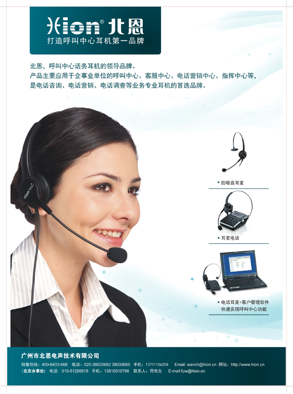 目前北恩Hion耳機品牌已覆蓋全球市場,在北京、上海、廣州、深圳、鄭州、南京設有售后服務中心,并在北美、歐洲、南亞等擁有核心合作伙伴。產品主要應用于電信、金融、電視購物、物流等客服中心以及總機接線員、指揮中心、呼叫中心等,是電話咨詢、電話營銷、電話調查等業(yè)務專業(yè)耳機首選產品。北恩采用最先進耳機生產技術,制造世界一流的通信耳機,全力打造呼叫中心話務耳機第一品牌。