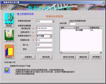 首先使用數(shù)據(jù)庫網(wǎng)關(guān)設(shè)計(jì)器定義數(shù)據(jù)庫配置,其中包括數(shù)據(jù)庫服務(wù)器的名稱和數(shù)據(jù)庫的登陸信息。該系統(tǒng)支持ODBC連接和ADO連接,支持的數(shù)據(jù)庫有ACCESS,SQL,MYSQL,ORACLE,SYBASE,配置方式如圖四所示。