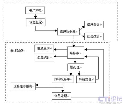 維修點(diǎn)對(duì)用戶的報(bào)修情況進(jìn)行預(yù)處理之后,根據(jù)用戶所在的區(qū)域,分配至最近距離的維修站,將用戶與其報(bào)修信息即時(shí)轉(zhuǎn)移,這也就是圖中所顯示的"轉(zhuǎn)站處理"。之后,維修站將直接打印出報(bào)修單,加快服務(wù)實(shí)施的效率、減少人工出錯(cuò)的比例,有專業(yè)人員及時(shí)上門服務(wù)檢修。