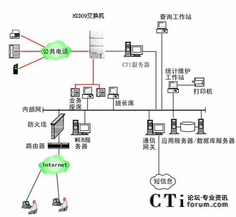 本系統(tǒng)物理結(jié)構(gòu)HXD交換機(jī)、CTI服務(wù)器、IVR(交互式語音應(yīng)答)/IFR(交互式傳真應(yīng)答)服務(wù)器、業(yè)務(wù)代表座席(邏輯上分為:普通業(yè)務(wù)代表座席、專家座席等)、班長座席、統(tǒng)計維護(hù)管理工作站、因特網(wǎng)(WEB)服務(wù)器、數(shù)據(jù)庫/應(yīng)用服務(wù)器、錄音工作站、網(wǎng)絡(luò)系統(tǒng)等構(gòu)成。