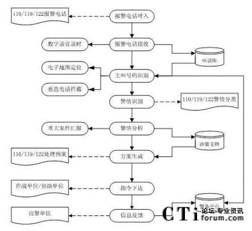 該系統(tǒng)主要分為電信子系統(tǒng)(完成聯(lián)動(dòng)中心與各電信公司之間話(huà)音的傳輸、交換和分配,以及主叫號(hào)碼和主叫地址的自動(dòng)查詢(xún)和傳輸?shù)龋、接警中心子系統(tǒng)(統(tǒng)一接聽(tīng)和處理市民的報(bào)警、求助電話(huà))、指揮調(diào)度子系統(tǒng)(或稱(chēng)為處警中心,通過(guò)直觀(guān)的地理信息系統(tǒng)和數(shù)據(jù)庫(kù),可以對(duì)所有的資源和警力分布了如指掌。通過(guò)一體化的無(wú)線(xiàn)數(shù)據(jù)傳輸和無(wú)線(xiàn)調(diào)度臺(tái)進(jìn)行方便的統(tǒng)一管理,指揮和調(diào)度)、信息網(wǎng)絡(luò)子系統(tǒng)(聯(lián)動(dòng)中心的骨干網(wǎng)絡(luò),把各種數(shù)據(jù)數(shù)庫(kù)、接處警席位、移動(dòng)的警用車(chē)載計(jì)算機(jī)等互聯(lián)在一起,形成一個(gè)強(qiáng)大的信息網(wǎng)絡(luò))、無(wú)線(xiàn)指揮調(diào)度通信子系統(tǒng)、大屏幕顯示子系統(tǒng)、地理信息子系統(tǒng)、GPS/GIS子系統(tǒng)。