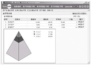 TurboCRM系統(tǒng)中的客戶價(jià)值金字塔,支持對分析結(jié)果中呈現(xiàn)的某個(gè)價(jià)值區(qū)間的客戶群進(jìn)行共性特征的抽象和提煉,幫助企業(yè)決策人發(fā)現(xiàn)重要客戶之間的共性,從而有助于尋找和挖掘最有價(jià)值的客戶(如表4、表5所示)。這一功能可以將零散的數(shù)據(jù)轉(zhuǎn)化為知識(shí),迅速地為企業(yè)決策人提供有效幫助。