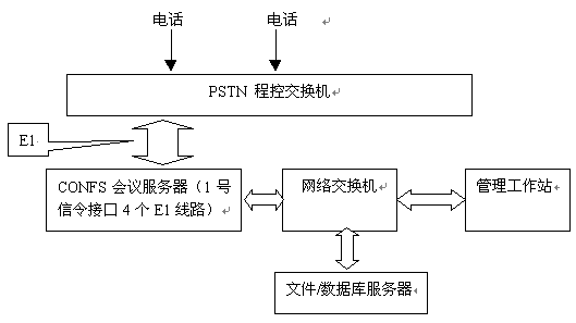 系統(tǒng)主要由網(wǎng)絡(luò)、數(shù)據(jù)庫服務(wù)器(DBS)、會議服務(wù)器(CONFS)、管理工作站幾個部分組成。數(shù)據(jù)庫服務(wù)器主要負責(zé)數(shù)據(jù)的存儲,而CONFS完成電話話路的接入與會議控制,彼此之間相輔相承。如圖所示: