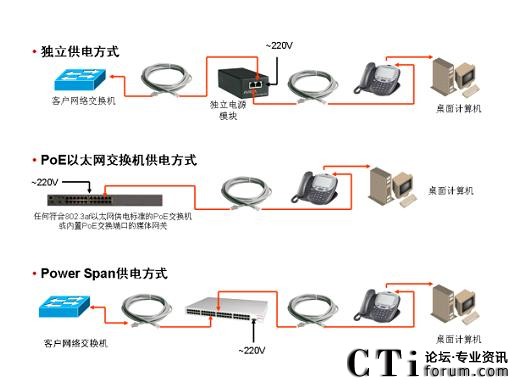 IP電話(huà)相對(duì)于原有模擬分機(jī)或數(shù)字分機(jī)采用以太網(wǎng)端口連接,其供電方式也相應(yīng)隨之改變,46xx系列IP硬件話(huà)機(jī)支持以下3種供電方式: