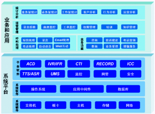 是呼叫中心的基礎(chǔ),實現(xiàn)了具體服務電話的接入和處理,由硬件設備、系統(tǒng)軟件和平臺軟件構(gòu)成。