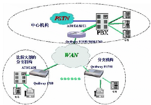 。。如圖是一個典型的企業(yè)網(wǎng)IP電話組網(wǎng)方案,在總部采用Quidway®R3640E/3680E路由器作為中心語音網(wǎng)關(guān)設(shè)備,在E1線路上實(shí)現(xiàn)VoIP功能;如果機(jī)構(gòu)規(guī)模不是很大,也可以采用AT0/E&M連接PBX;在各分支機(jī)構(gòu)及網(wǎng)點(diǎn),則可采用Quidway®