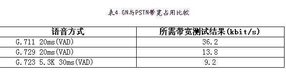 為進(jìn)一步節(jié)省帶寬,又采用語(yǔ)音激活檢測(cè)技術(shù)(VAD)及舒適噪音生成(CNG)技術(shù),VAD技術(shù)只有當(dāng)檢測(cè)到語(yǔ)音處于活動(dòng)狀態(tài)時(shí),編碼器的輸出信號(hào)才被送到網(wǎng)絡(luò)上,因此節(jié)省了帶寬。而在靜音時(shí)段采用CNG技術(shù),生成與背景噪聲相匹配的較舒適的靜音,避免了用戶(hù)有不自然的交談感覺(jué),保證通話(huà)質(zhì)量。實(shí)際測(cè)試結(jié)果如表4,采用G.72920ms打包+VAD技術(shù)節(jié)省了近75%的帶寬。