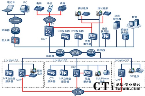 華為多媒體聯(lián)絡(luò)中心提供完善的分布式組網(wǎng)及集中式組網(wǎng)功能,可以提供分布式接入、分布式IVR、分布式錄音系統(tǒng)、分布式坐席、分布式傳真系統(tǒng)及網(wǎng)絡(luò)呼叫中心技術(shù)。如果各個分支機(jī)構(gòu)有較多本地化業(yè)務(wù)需求的時候,各個分支機(jī)構(gòu)只需要再配置一臺CTI服務(wù)器,就可以升級成完整的聯(lián)絡(luò)中心系統(tǒng),可以單獨(dú)開展豐富的個性化業(yè)務(wù)。如果總部再安裝一套網(wǎng)絡(luò)呼叫中心,則可以實(shí)現(xiàn)聯(lián)絡(luò)中心的互連,即網(wǎng)絡(luò)呼叫中心。
