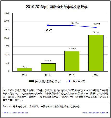 艾瑞咨詢數(shù)據(jù)顯示,截至2011年底,中國移動支付交易規(guī)?傤~將達到481.4億元,同比增長149.4%,整體呈現(xiàn)爆發(fā)式的增長態(tài)勢。艾瑞預計,中國移動支付交易規(guī)模將在2013年底超過2000億元。