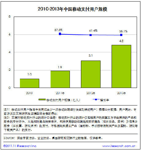 根據(jù)艾瑞咨詢統(tǒng)計數(shù)據(jù),2011年中國移動支付用戶規(guī)模將達到1.9億。艾瑞預計,2013年中國移動支付用戶規(guī)模將達到4.8億。移動網(wǎng)上支付用戶規(guī)模的增長帶動了整個行業(yè)用戶規(guī)模的爆發(fā),另外手機短信支付也在用戶群體中得到了進一步的普及。