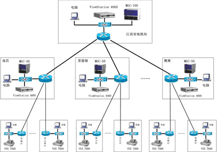系統(tǒng)的具體設(shè)備配置為:在省局配備MGC--100一臺,省局會議室使用POLYCOM公司VSX7000會議終端一臺及VS4000會議終端兩臺;在南昌、景德鎮(zhèn)、九江等11個市局全部配備MGC-50各一臺以及POLYCOM公司VS4000會議終端各一臺,VSX7000會議終端各若干臺(共131臺),從而實現(xiàn)整個視頻會議網(wǎng)絡(luò)的多點(diǎn)視頻會議功能。