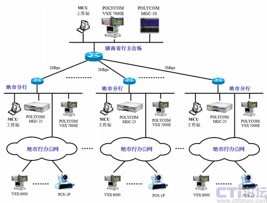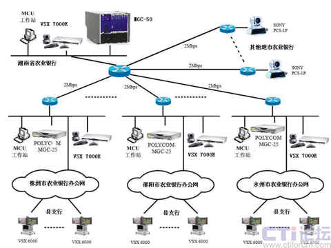 在株洲、邵陽和永州市行采用級聯(lián)的方式來實現(xiàn)。具體實現(xiàn)方式為:VSX 7000E則和地市行的MGC-25通訊,并且MGC-25負責其縣支行終端的接入,同時用MGC-50和MGC-25的端口級聯(lián),采用這種連接方式就可以實現(xiàn)從省行-地市行-縣支行的三級網(wǎng)視頻會議的召開。