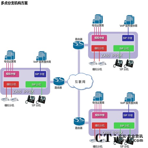 ZX60不僅具有本地電話分機(jī)接口,還運(yùn)行IP電話機(jī)遠(yuǎn)程注冊,無論你若干個辦公室分布在何處,都可以打造成你內(nèi)部免費通話的集團(tuán)電話通信系統(tǒng),節(jié)約你的內(nèi)部通信成本,提高辦公效率。
