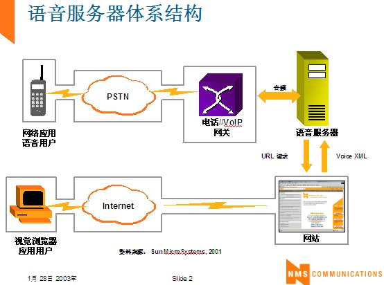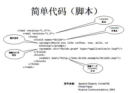 世界上最古老的用戶界面--人類語言終于在二十一世紀借助于VoiceXML,一種語音可擴展標記語言發(fā)展成熟起來。作為世界上第一個真正的語音通信標準,它定義了應用開發(fā)商向用戶提供新型信息訪問服務的方式。通過這種服務,用戶在任何地方,都可以通過電話或任何移動設備,虛擬訪問任何信息。VoiceXML正在被廣泛應用于旅游、金融與信息服務等行業(yè)的各種業(yè)務領域中,甚至是政府部門與市政機構,全球的無線運營商等。