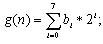 對數(shù)據(jù)作”值的轉(zhuǎn)換”的方法,其意思為:對要加密的檔案中的每一筆數(shù)據(jù),對它的內(nèi)容值作轉(zhuǎn)換。舉例而言,如果要加密的數(shù)據(jù)為一個圖文件,則此方法會對每一個像素作處理,并改變每一個像素的值。首先,其對每一個字節(jié)(byte)的值,拆開成為binary的形式,如式(1.1)所示,其中g(shù)(n)表示要加密檔案中的一個字節(jié),其中n=0,