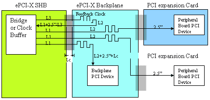 由于加了PCI-X,底板上的時鐘的長度就成為關(guān)鍵了。規(guī)范的作者要定義應能與各種底板互操作的SHB。這挑戰(zhàn)是在SHB上的PCI-X接口需要一個具有相等于底板上時鐘走線長度延時的反饋時鐘。這反饋時鐘是在底板上并且它的長度是以從SHB插槽到PCI插板插槽的時鐘的長度為基礎的。在下面畫的圖中,從橋到三個目的地中任何一個的時鐘距離是相同長度的。