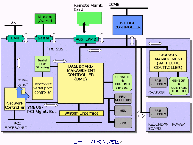 圖一為整個IPMI架構(gòu)的示意圖。位于整個架構(gòu)中心的部份即為我們所謂的Baseboard Management Controller (BMC)。它通過各別的界面來管理整個系統(tǒng),如系統(tǒng)狀態(tài)偵測及事件過濾、電源管理、記錄事件發(fā)生時間及系統(tǒng)回復控制,并且透過網(wǎng)絡(luò)或串行端口來告知管理人員,另外,它提供了IPMB的總線來和外部的管理控制器互相溝通。